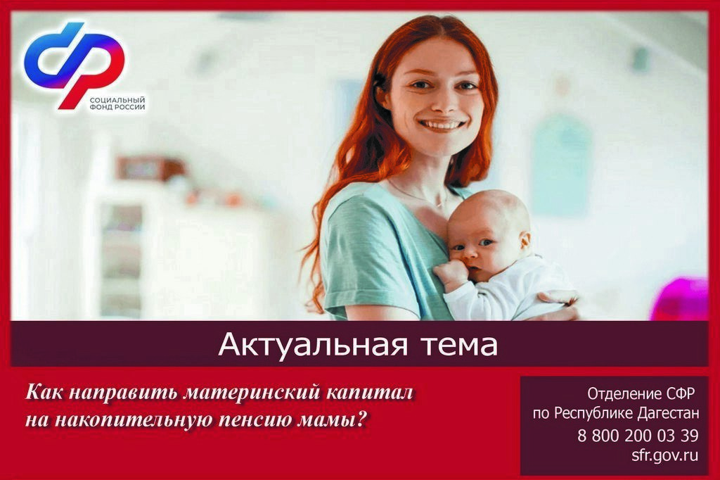 «Заявление о распоряжении материнским капиталом можно подать через “личный кабинет” на портале “Госуслуги”, в МФЦ или через клиентскую службу Отделения СФР по Республике Дагестан лично. Женщины, которые изначально выбрали такой вариант использования средств материнского капитала, впоследствии могут изменить свой выбор для распоряжения средствами маткапитала по другим направлениям: улучшение жилищных условий, получение образования ребенком либо на социальную адаптацию и интеграцию в общество детей-инвалидов, ежемесячную выплату», – говорится в сообщении.