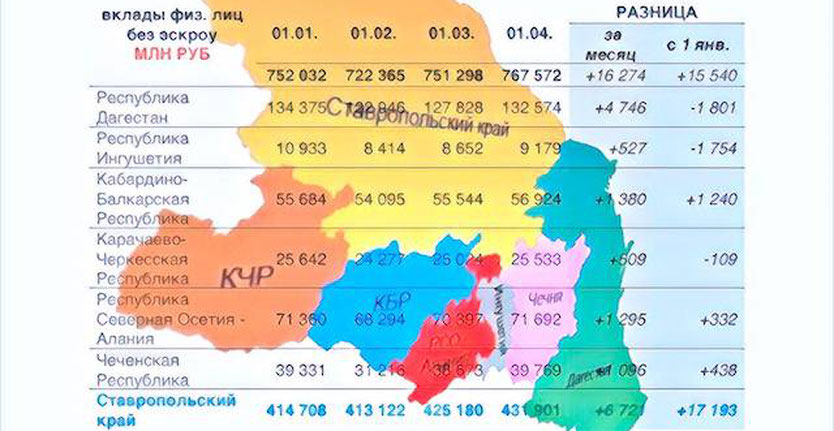 Не смотря на то, что официально численность жителей Дагестана больше чем в Ставропольском крае на 300 тысяч человек, объёмы вкладов физических лиц в республике меньше в 3,2 раза.