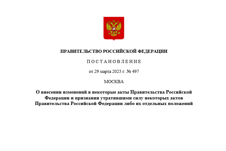 Постановление Правительства РФ от 29 марта 2023 г. № 497 "О внесении изменений в некоторые акты Правительства Российской Федерации и признании утратившими силу некоторых актов Правительства Российской Федерации либо их отдельных положений"