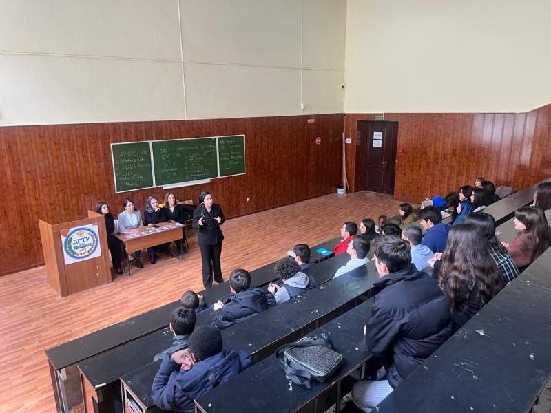 Беседу со студентами в форме диалога провели сотрудники министерства по национальной политике и делам религий РД Оксана Ибрагимова, Аминат Магомедова и капитан полиции, сотрудник ЦПЭ МВД по РД Сабина Сункулиева.