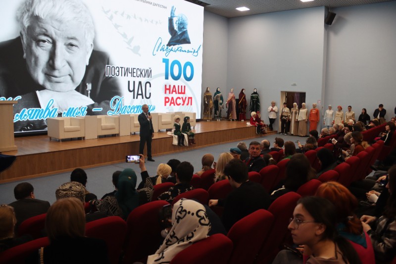Началось мероприятие с показа национальных костюмов, созданных студентами техникума дизайна, экономики и права. Кроме того, в фойе развернулась выставка фотографий из жизни Расула Гамзатова.