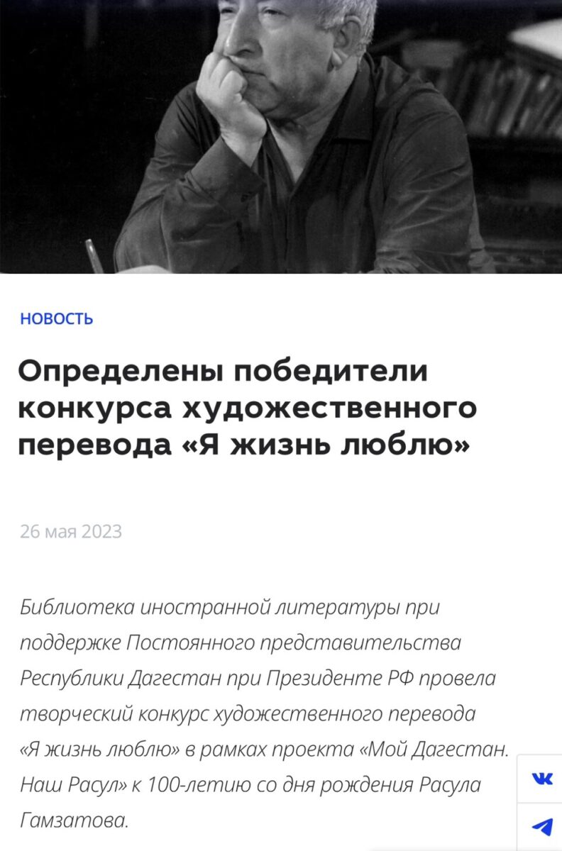Библиотека иностранной литературы имени Рудомино при поддержке Постоянного представительства Республики Дагестан при Президенте РФ провела творческий конкурс художественного перевода «Я жизнь люблю» в рамках проекта «Мой Дагестан. Наш Расул» к 100-летию со дня рождения Расула Гамзатова.