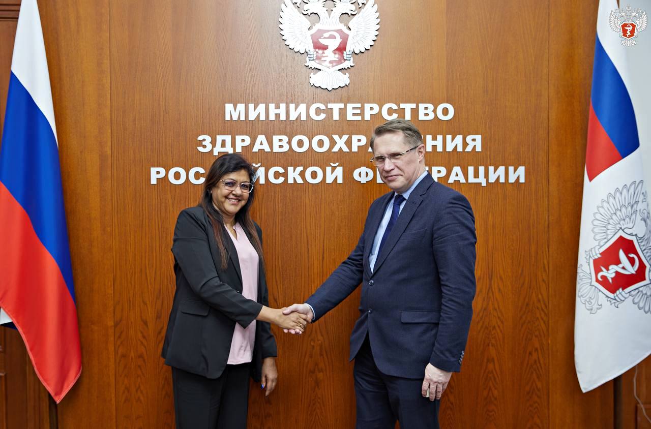 Министр здравоохранения РФ Михаил Мурашко и Чрезвычайный и Полномочный Посол Демократической Социалистической Республики Шри-Ланка в России Джанита Лиянаге провели встречу по вопросам развития существующих и новых направ