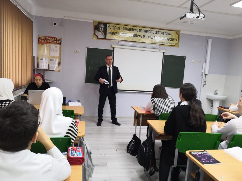 На базе гимназии №11 и лицея №3 г. Махачкалы представители Республиканского центра русского языка и культуры Министерства по национальной политике и делам религий РД в лице директора Руслана Лугового и главных специалистов Самвела Муслимова и Светланы Бондаревой провели мероприятия на тему: «Краткий курс об истории России, а также целях и задачах СВО» для учащихся 9, 10 и 11 классов.