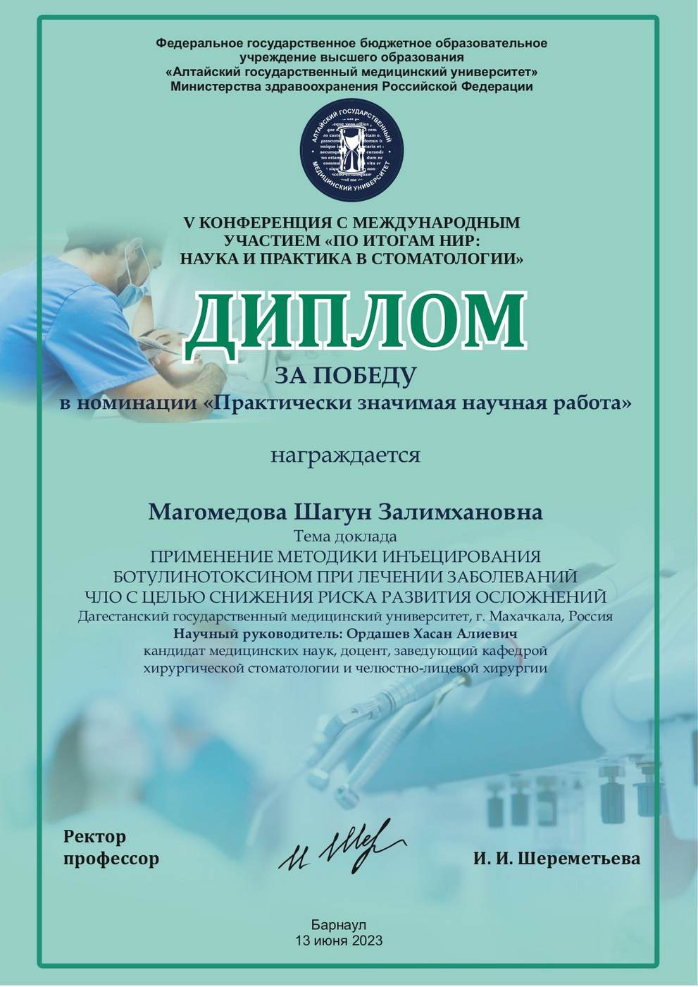 На конференции ДГМУ представила студентка 4 курса стоматологического факультета Магомедова Шагун Залимхановна, с докладом на тему: «Применение методики инъецирования ботулинотоксином при лечении заболеваний ЧЛО с целью снижения риска развития заболеваний» под руководством кандидата медицинских наук, доцента, заведующего кафедрой хирургической стоматологии и челюстно-лицевой хирургии с УВ Ордашева Хасана Алиевича, ассистента кафедры хирургической стоматологии и челюстной-лицевой хирургии с УВ Юнусовой Миланы Наримановны.
