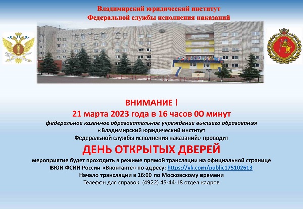 21 марта 2023 года в 16:00 в федеральном казенном образовательном учреждении высшего образования «Владимирский юридический институт Федеральной службы исполнения наказаний» состоится «День открытых дверей» для абитуриент