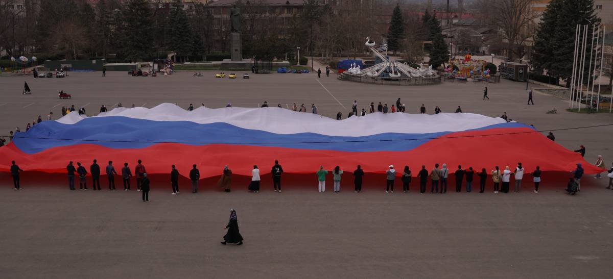 Так, на центральной площади г. Буйнакск молодогвардейцы при поддержке студенческой молодежи города развернули большой флаг Российской Федерации, размерами более 1000 кв. метров, под звуки государственного гимна страны.