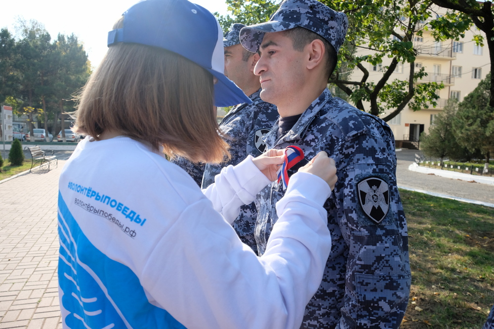 В рамках акции активисты движения провели на базах подразделений территориального управления ведомства раздачу ленточек-триколоров для росгвардейцев. Волонтеры Победы вспомнили с бойцами Росгвардии об истории создания праздника, о том, какую важную роль играет единство народов России.