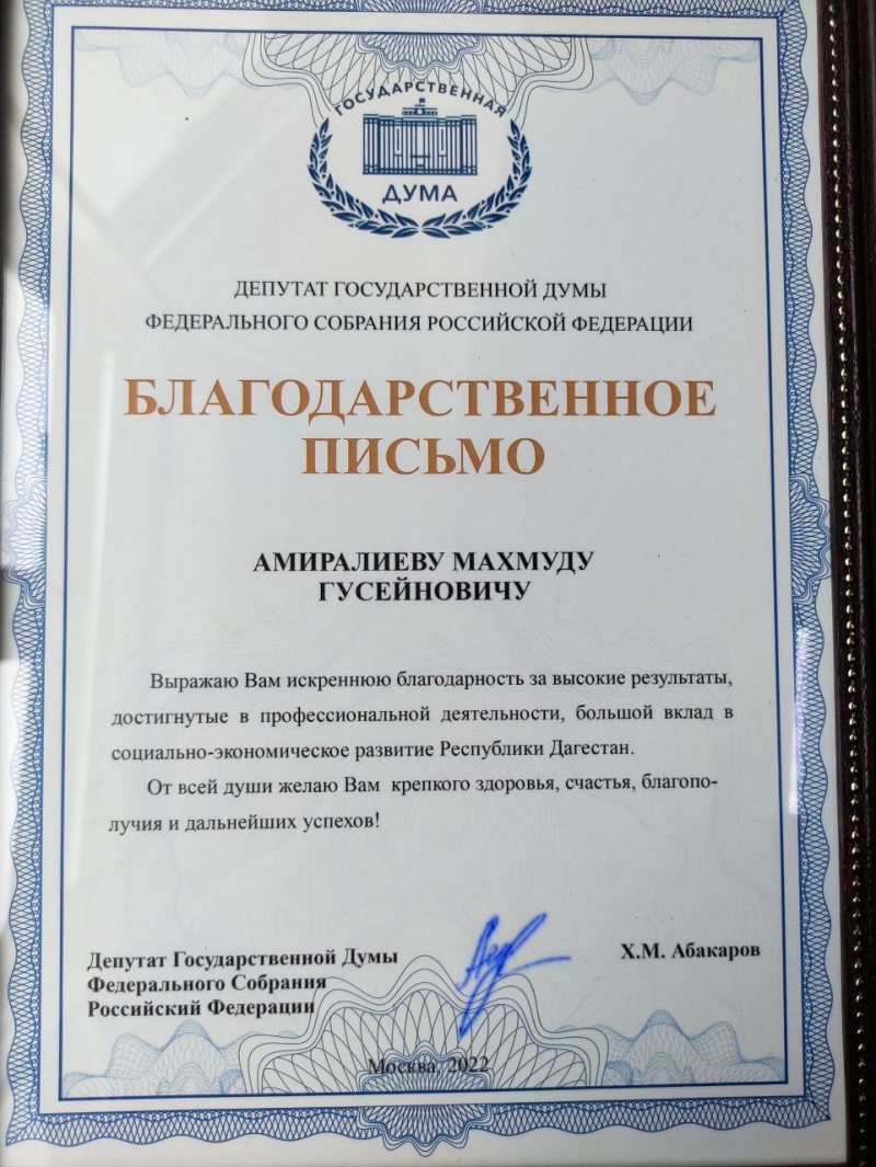 Благодарственное письмо от депутата Госдумы