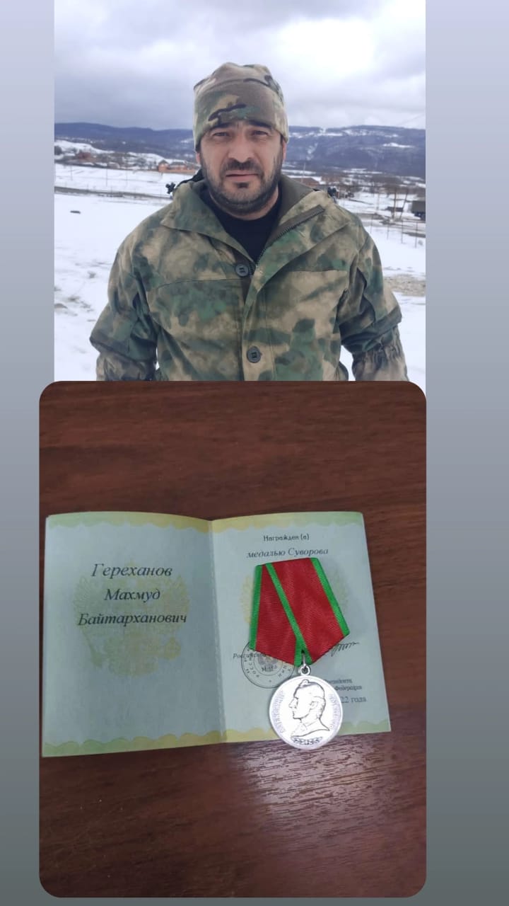 Участник специальной военной операции на территории Украины из с.Калининаул Казбековского района Махмуд Гереханов удостоен медали Суворова.