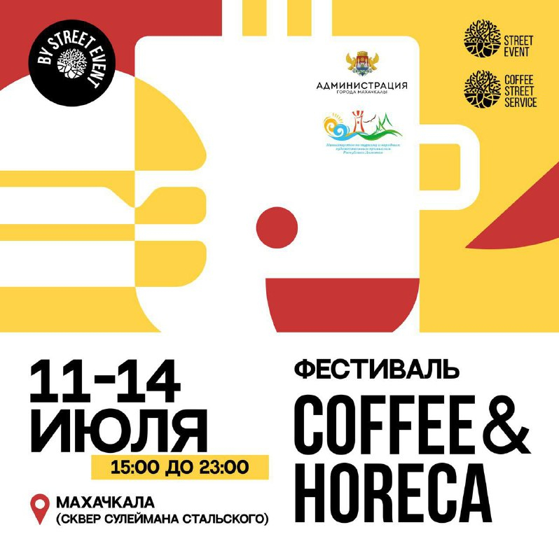 Министерство туризма РД, администрация города Махачкалы и компания Street Event ждет вас 11-14 июля на фестивале «COFFEE&HORECA», где вас ждут: много кофе и вкусной еды; детские и спортивные активности;
