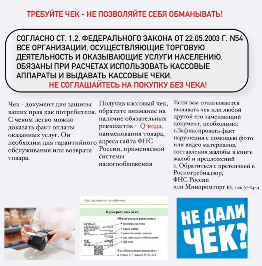 Минпромторг РД информирует, что потребитель имеет право на приобретение товаров и услуг надлежащего качества, на их безопасность, на информацию о товарах, услугах и об их изготовителях, право на возмещение вреда, причиненного вследствие недостатков товара, услуги, а также требовать чеки.