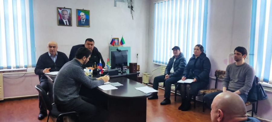 Выездное совещание провел начальник отдела взаимодействия с органами местного самоуправления и работы с обращениями граждан администрации района Анвар Абдулгалимов. Приняли участие: главный специалист отдела экономики администрации района Кавказ Эфендиев, ведущий специалист отдела земельных и имущественных отношений Элбрус Ибрагимов, Руслан Салманов - главный специалист ОЗИО, ведущий специалист МКУ «Отдел сельского хозяйства»–Азнаур Рамазанов, ведущий специалист МКУ «Отдел строительства, архитектуры и ЖКХ» Гаджи Абдулкадиров.
