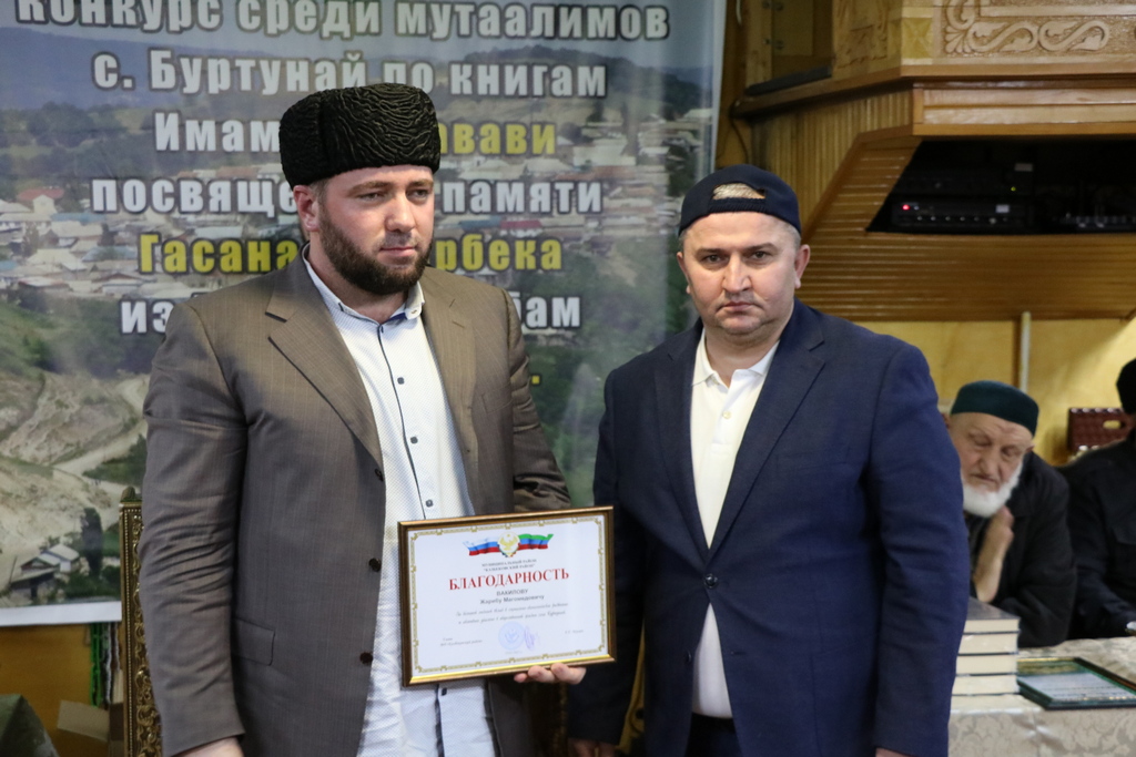 29 января в центральной мечети селения Буртунай Казбековского района состоялся маджлис, посвященный награждению победителей конкурса среди мутаалимов с.Буртунай по книгам имама ан-Навави, посвященный памяти наибов имама Шамиля Гасана и Гаирбека из Буртуная. В церемонии награждения победителей принял участие и глава муниципалитета Гаджимурад Мусаев.