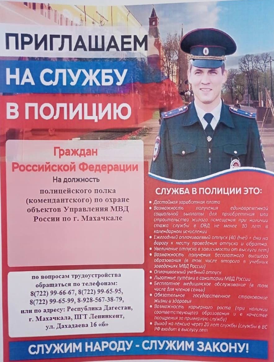 На должность полицейского полка (комендантского) по охране объектов Управления МВД России по г.Махачкале По вопросам трудоустройства звонить по номеру: