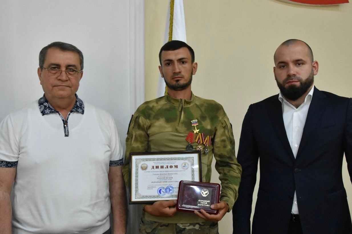 Затем за особые заслуги перед многонациональным народом Дагестана золотой звездой с присвоением звания Народный Герой Дагестана были награждены: