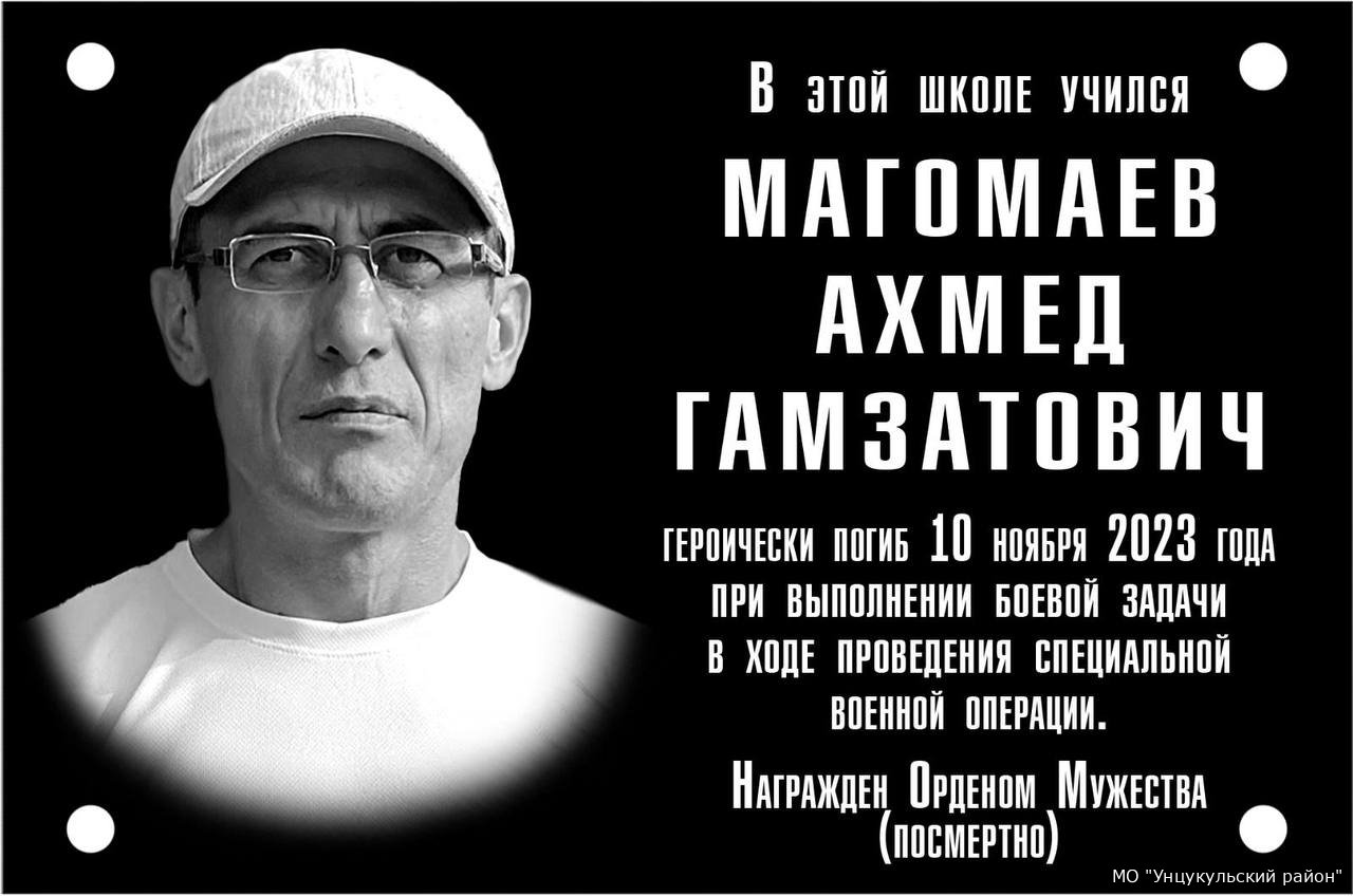 В школе, где учился Ахмед Магомаев установили мемориальную доску, Ахмед в ноябре 2023 года погиб при выполнении боевой задачи на территории проведения специальной военной операции за, что был награждён "Орденом Мужества" посмертно.