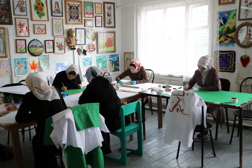 За оформление коридора длиной в 120 метров взялась волонтёрская группа женщин отдела просвещения и художницы Районной детской школы искусств. Работники РДШИ Абуева Зухра и Нуцалова Патимат вместе с руководителем волонтёрской группы женщин Алисултановой Джамилей вкратце ознакомили съемочную группу ЕИЦ как организовано изготовление оформительских атрибутов: флагов и светящихся гирлянд.