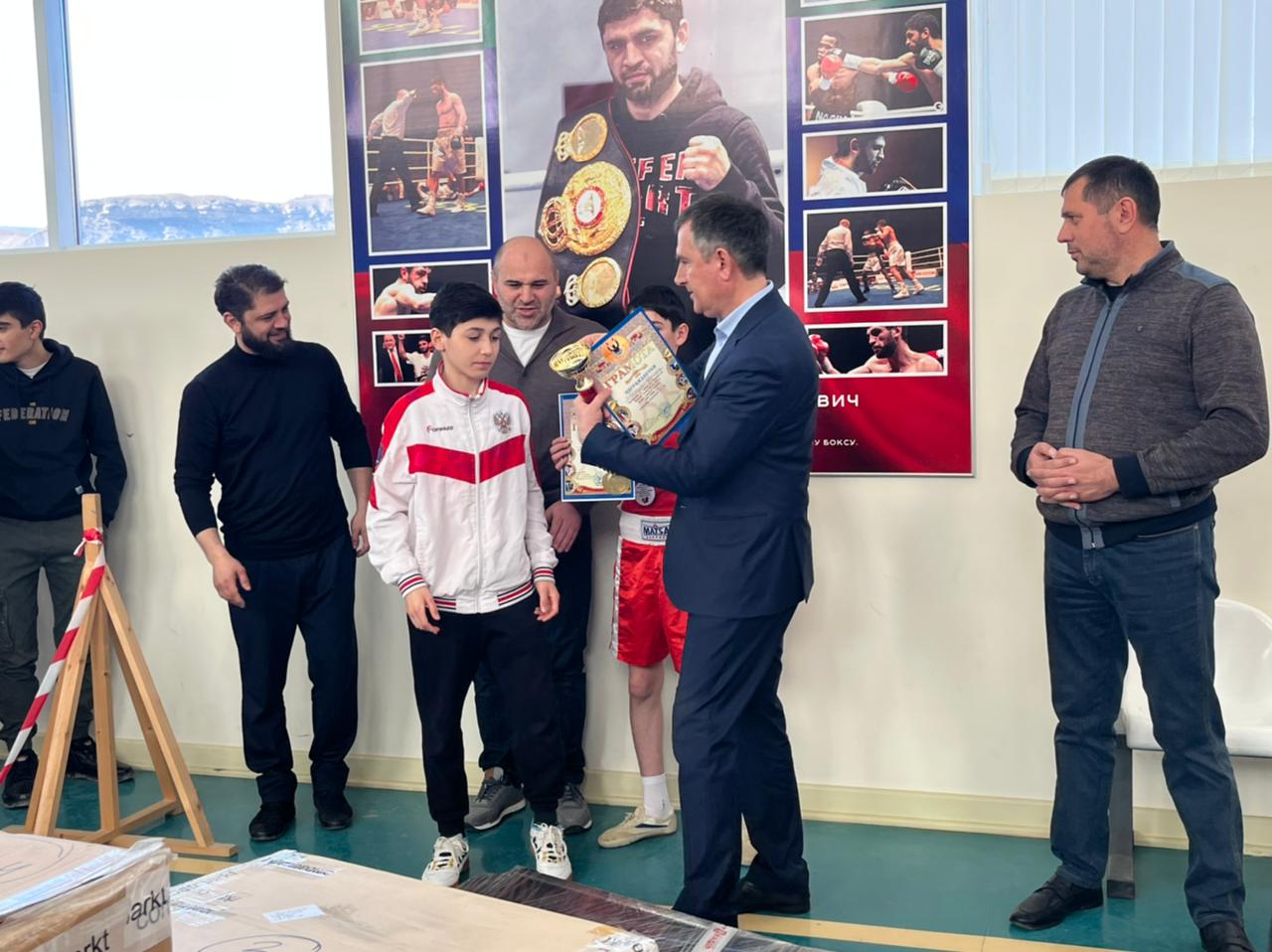 За церемонией награждения последовало еще одно приятное событие для Центра бокса. По поручению Главы Дагестана министр спорта республики Сажид Сажидов передал Центру бокса им. Хабиба Аллахвердиева спортивные инвентарь и экипировку.