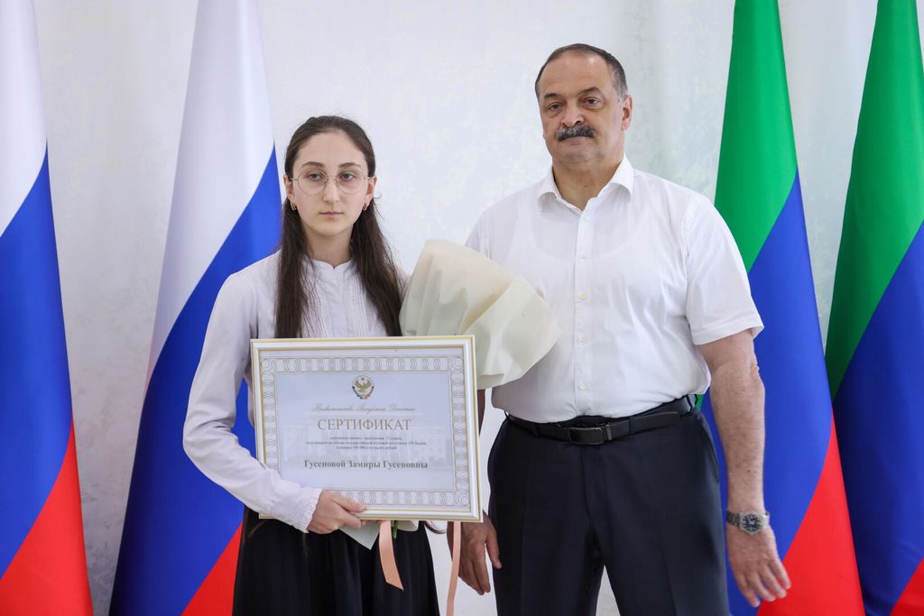 «Результат школьников — успех для всей республики. Вы по праву считаетесь гордостью Дагестана! Хочу поблагодарить вас за достижение высоких результатов. Не важно, где и на кого вы будете учиться. Важно, чтобы выбранная профессия приносила пользу Родине, радовала ваших педагогов и родителей, давала возможность вам испытывать чувство удовлетворения», — отметил Глава региона и вручил выпускникам сертификаты на 100 тысяч рублей. Он также выразил слова благодарности их родителям и педагогам.