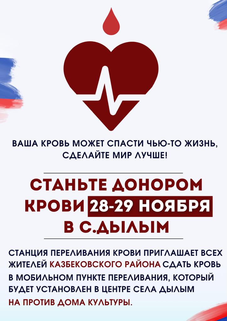 28-29 ноября жители Казбековского района от 18 лет и старше могут стать донорами крови.